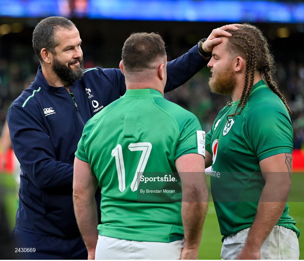11 February 2023; Ireland head coach Andy Farrell, left, with Dave Kilcoyne and Finlay Bealham, right, after the Guinness Six Nations Rugby Championship match between Ireland and France at the Aviva Stadium in Dublin. Photo by Brendan Moran/Sportsfile