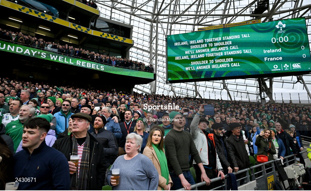 11 February 2023; Ireland supporters sing Ireland's Call before the Guinness Six Nations Rugby Championship match between Ireland and France at the Aviva Stadium in Dublin. Photo by Brendan Moran/Sportsfile