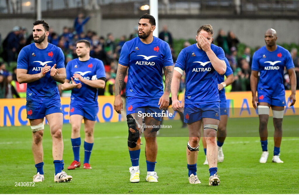 11 February 2023; France players, from left, Charles Ollivon, Romain Taofifenua and Anthony Jelonch after the Guinness Six Nations Rugby Championship match between Ireland and France at the Aviva Stadium in Dublin. Photo by Brendan Moran/Sportsfile