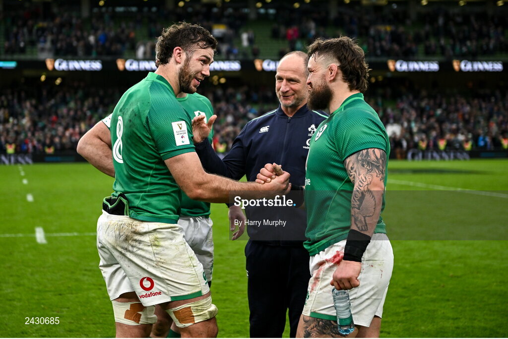 11 February 2023; Caelan Doris, Ireland assistant coach Mike Catt and Andrew Porter of Ireland after their side's victory in the Guinness Six Nations Rugby Championship match between Ireland and France at the Aviva Stadium in Dublin. Photo by Harry Murphy/Sportsfile