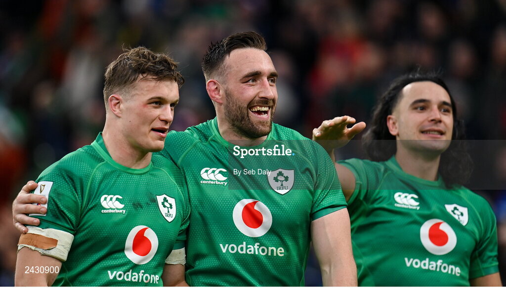 11 February 2023; Ireland players, from left, Josh van der Flier, Jack Conan and James Lowe after their side's victory in the Guinness Six Nations Rugby Championship match between Ireland and France at the Aviva Stadium in Dublin. Photo by Seb Daly/Sportsfile