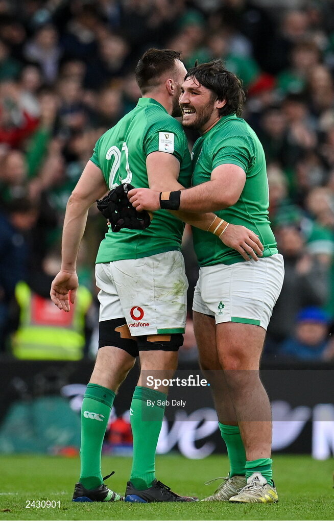 11 February 2023; Tom O’Toole, right, and Jack Conan of Ireland after their side's victory in the Guinness Six Nations Rugby Championship match between Ireland and France at the Aviva Stadium in Dublin. Photo by Seb Daly/Sportsfile