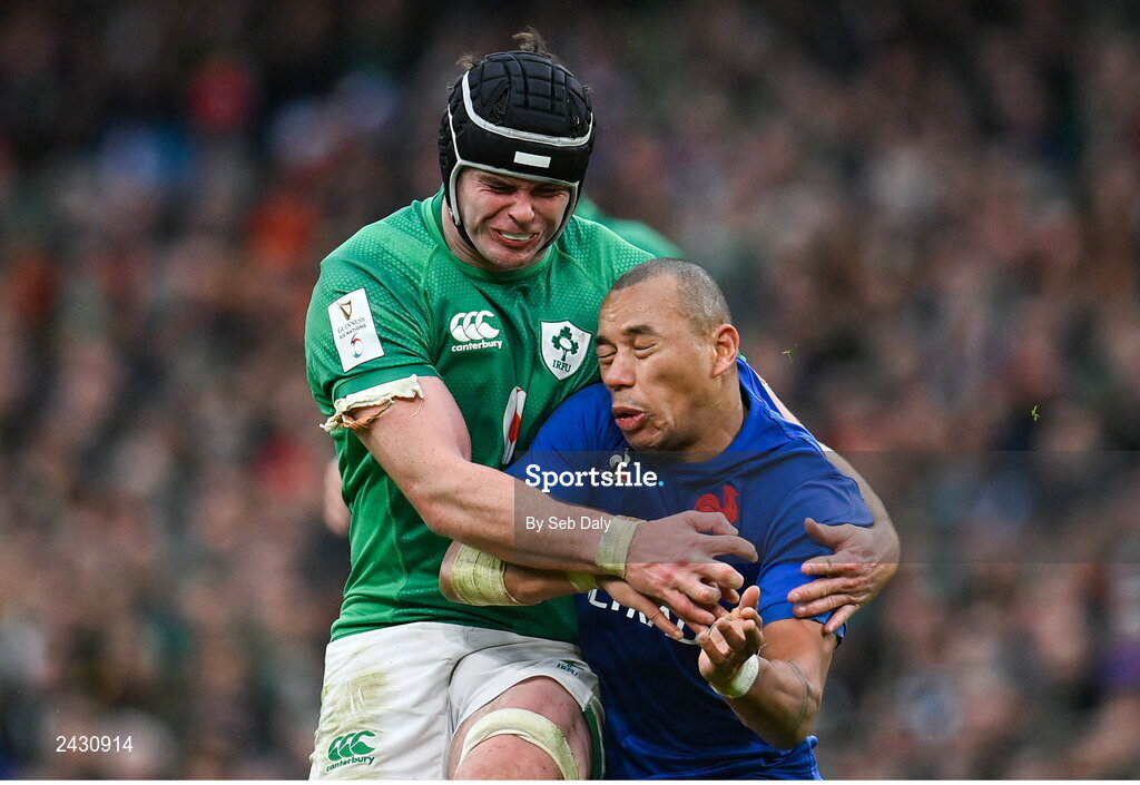 11 February 2023; James Ryan of Ireland tackles Gael Fickou of France during the Guinness Six Nations Rugby Championship match between Ireland and France at the Aviva Stadium in Dublin. Photo by Seb Daly/Sportsfile