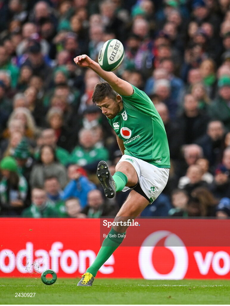 11 February 2023; Ross Byrne of Ireland kicks a conversion during the Guinness Six Nations Rugby Championship match between Ireland and France at the Aviva Stadium in Dublin. Photo by Seb Daly/Sportsfile
