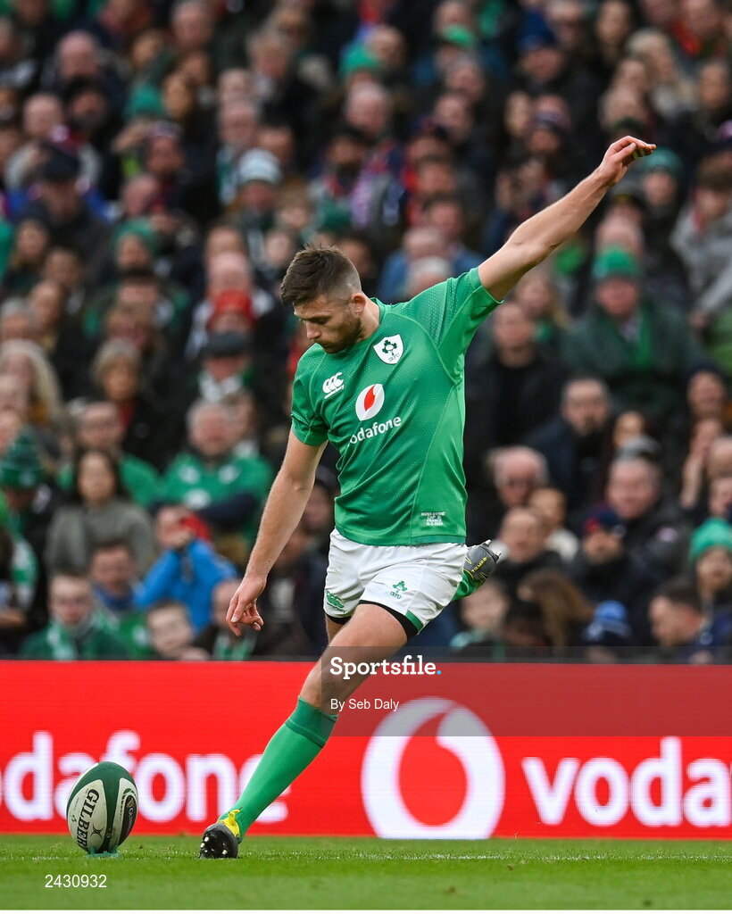 11 February 2023; Ross Byrne of Ireland kicks a conversion during the Guinness Six Nations Rugby Championship match between Ireland and France at the Aviva Stadium in Dublin. Photo by Seb Daly/Sportsfile