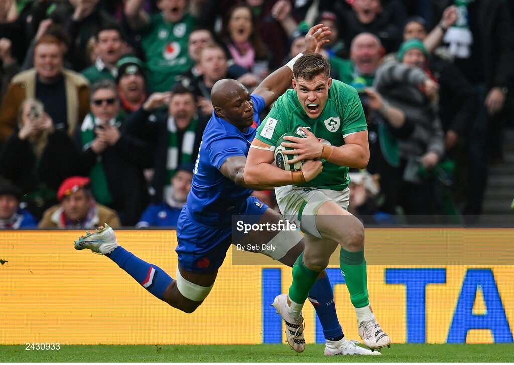 11 February 2023; Garry Ringrose of Ireland on his way to scoring his side's fourth try during the Guinness Six Nations Rugby Championship match between Ireland and France at the Aviva Stadium in Dublin. Photo by Seb Daly/Sportsfile