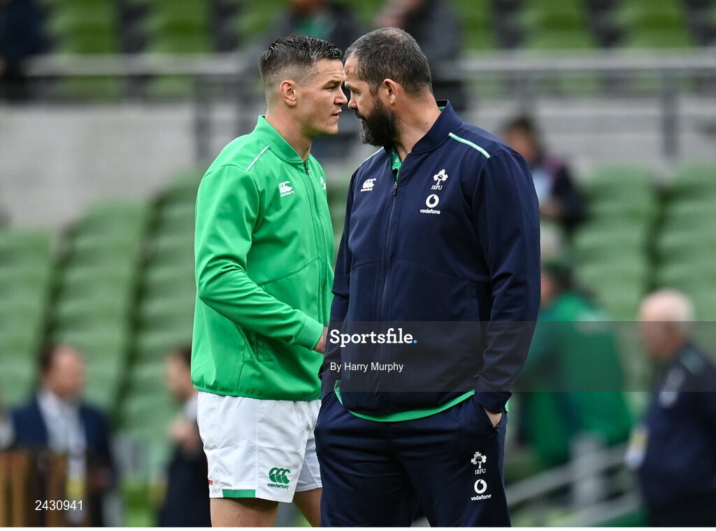 11 February 2023; Ireland head coach Andy Farrell, right, and Jonathan Sexton of Ireland before the Guinness Six Nations Rugby Championship match between Ireland and France at the Aviva Stadium in Dublin. Photo by Harry Murphy/Sportsfile