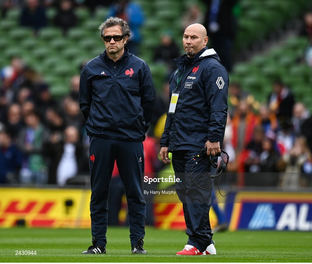 11 February 2023; France head coach Fabien Galthié and performance coach Thibault Giroud during the Guinness Six Nations Rugby Championship match between Ireland and France at the Aviva Stadium in Dublin. Photo by Harry Murphy/Sportsfile