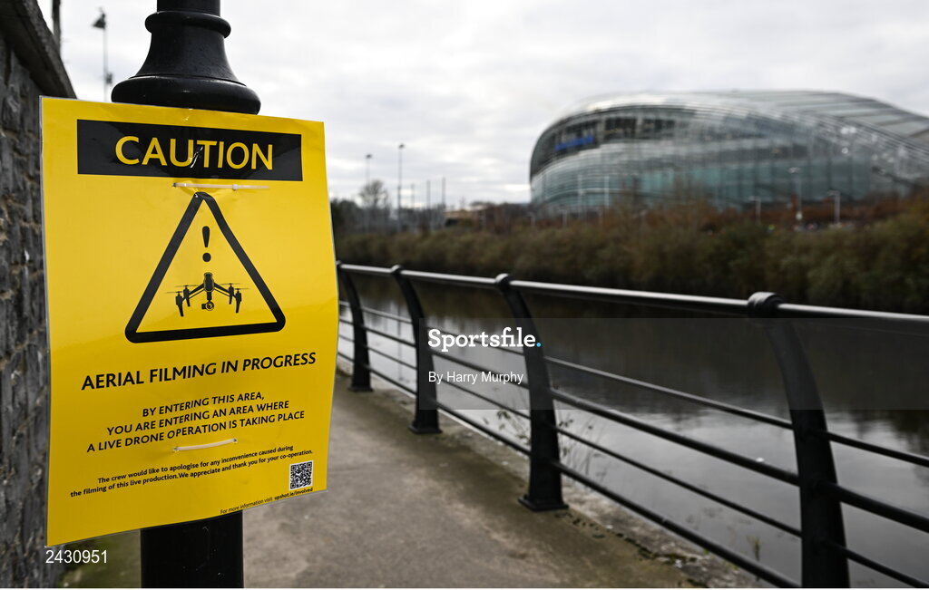 11 February 2023; A drone sign is seen before the Guinness Six Nations Rugby Championship match between Ireland and France at the Aviva Stadium in Dublin. Photo by Harry Murphy/Sportsfile