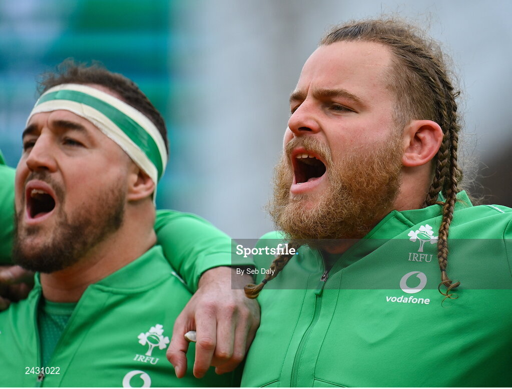11 February 2023; Finlay Bealham, right, and Rob Herring of Ireland before the Guinness Six Nations Rugby Championship match between Ireland and France at the Aviva Stadium in Dublin. Photo by Seb Daly/Sportsfile