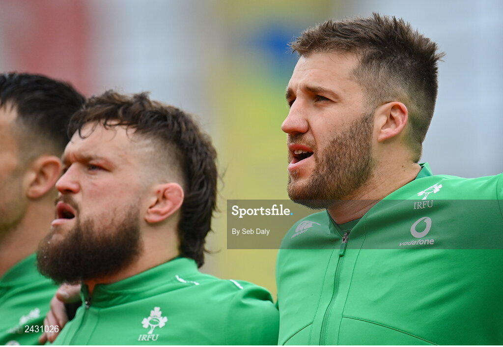 11 February 2023; Stuart McCloskey, right, and Andrew Porter of Ireland before the Guinness Six Nations Rugby Championship match between Ireland and France at the Aviva Stadium in Dublin. Photo by Seb Daly/Sportsfile