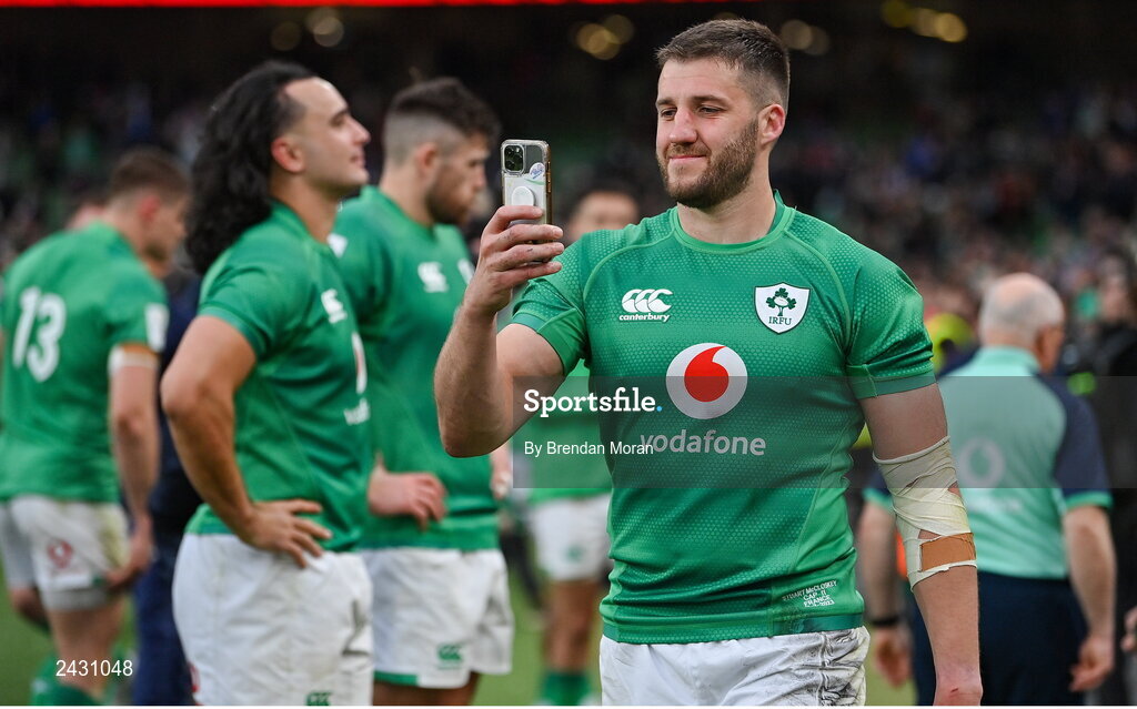 11 February 2023; Stuart McCloskey of Ireland takes a photo with a smartphone after the Guinness Six Nations Rugby Championship match between Ireland and France at the Aviva Stadium in Dublin. Photo by Brendan Moran/Sportsfile