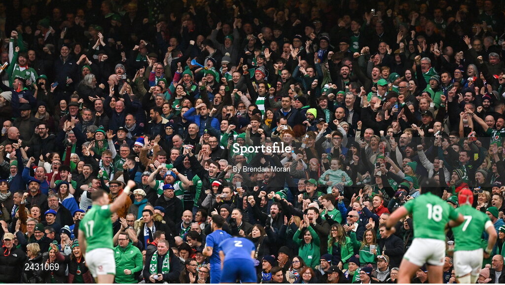 11 February 2023; Ireland supporters cheer their side after they scored a fourth try during the Guinness Six Nations Rugby Championship match between Ireland and France at the Aviva Stadium in Dublin. Photo by Brendan Moran/Sportsfile