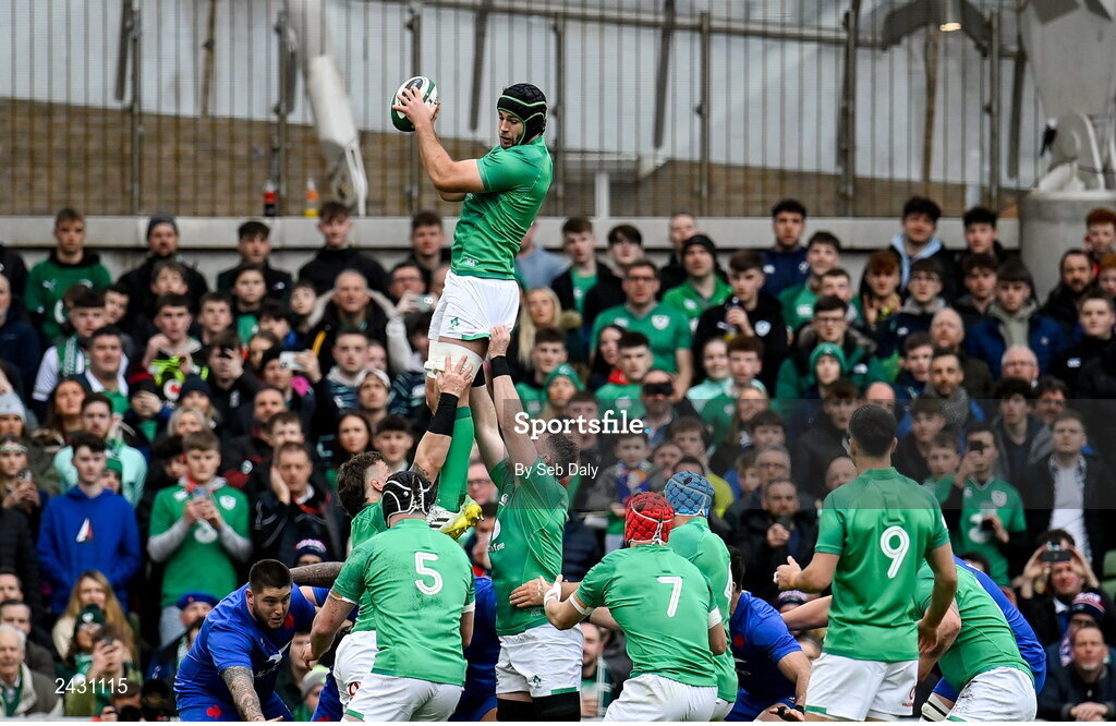 11 February 2023; Caelan Doris of Ireland takes possession in a lineout during the Guinness Six Nations Rugby Championship match between Ireland and France at the Aviva Stadium in Dublin. Photo by Seb Daly/Sportsfile