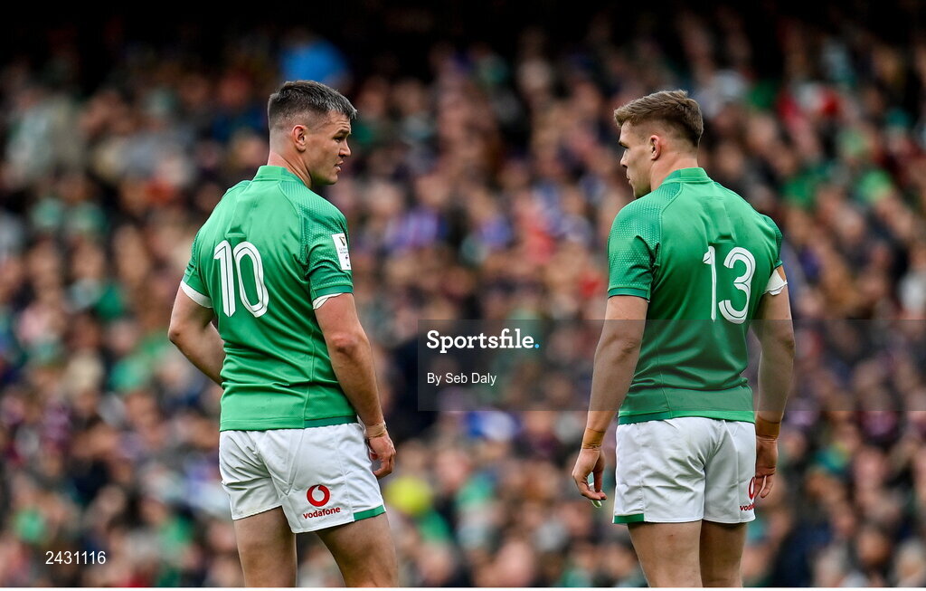 11 February 2023; Jonathan Sexton, left, and Garry Ringrose of Ireland during the Guinness Six Nations Rugby Championship match between Ireland and France at the Aviva Stadium in Dublin. Photo by Seb Daly/Sportsfile