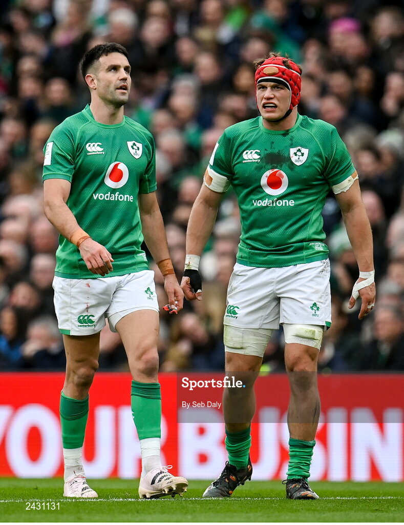 11 February 2023; Conor Murray, left, and Josh van der Flier of Ireland during the Guinness Six Nations Rugby Championship match between Ireland and France at the Aviva Stadium in Dublin. Photo by Seb Daly/Sportsfile