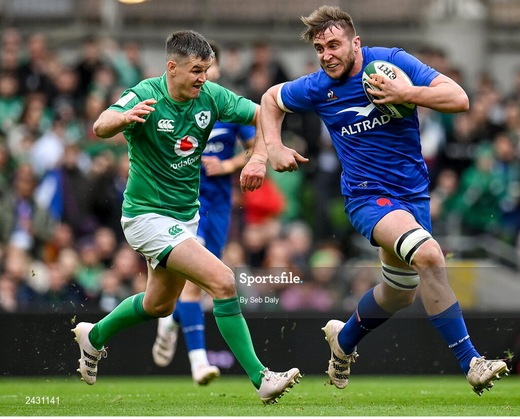11 February 2023; Anthony Jelonch of France in action against Jonathan Sexton of Ireland during the Guinness Six Nations Rugby Championship match between Ireland and France at the Aviva Stadium in Dublin. Photo by Seb Daly/Sportsfile