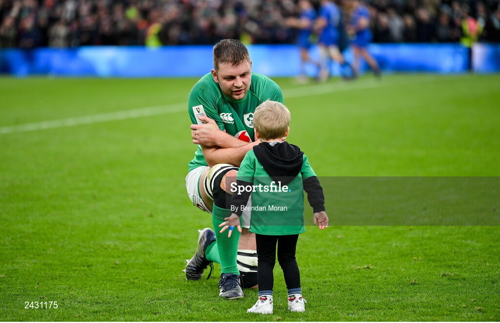 11 February 2023; Iain Henderson of Ireland with his son Freddy after the Guinness Six Nations Rugby Championship match between Ireland and France at the Aviva Stadium in Dublin. Photo by Brendan Moran/Sportsfile