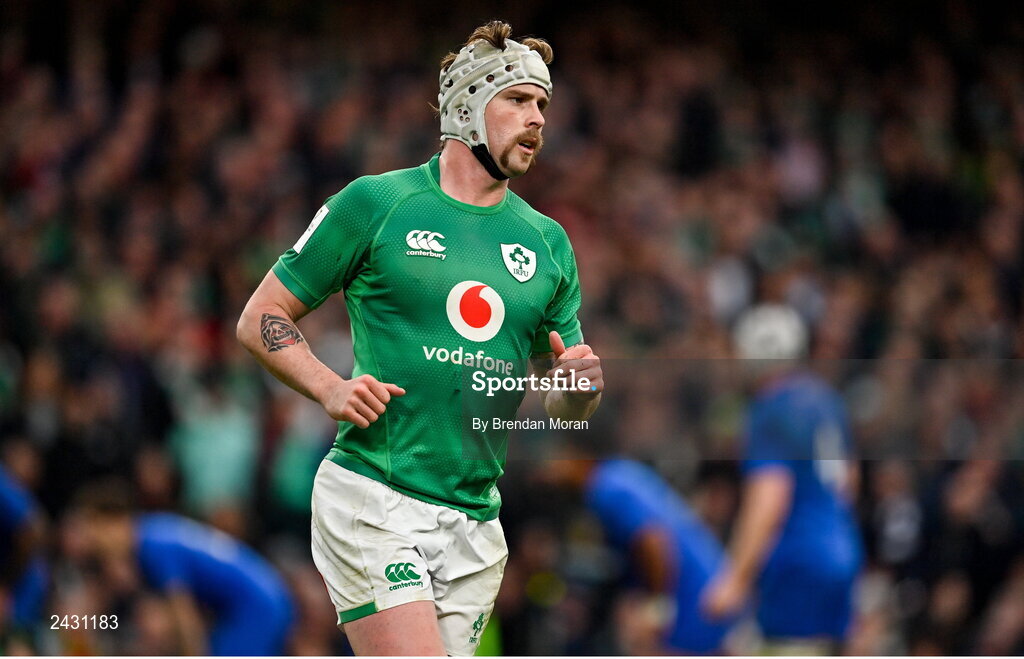 11 February 2023; Mack Hansen of Ireland during the Guinness Six Nations Rugby Championship match between Ireland and France at the Aviva Stadium in Dublin. Photo by Brendan Moran/Sportsfile