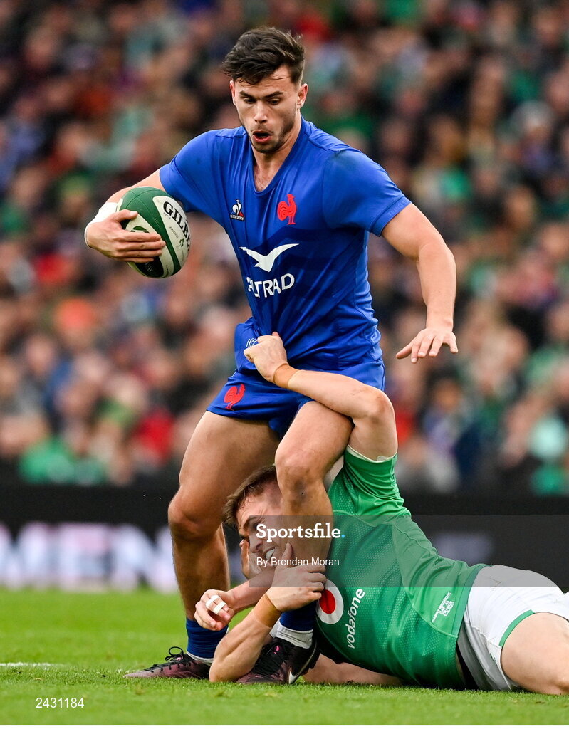 11 February 2023; Ethan Dumortier of France is tackled by Garry Ringrose of Ireland during the Guinness Six Nations Rugby Championship match between Ireland and France at the Aviva Stadium in Dublin. Photo by Brendan Moran/Sportsfile