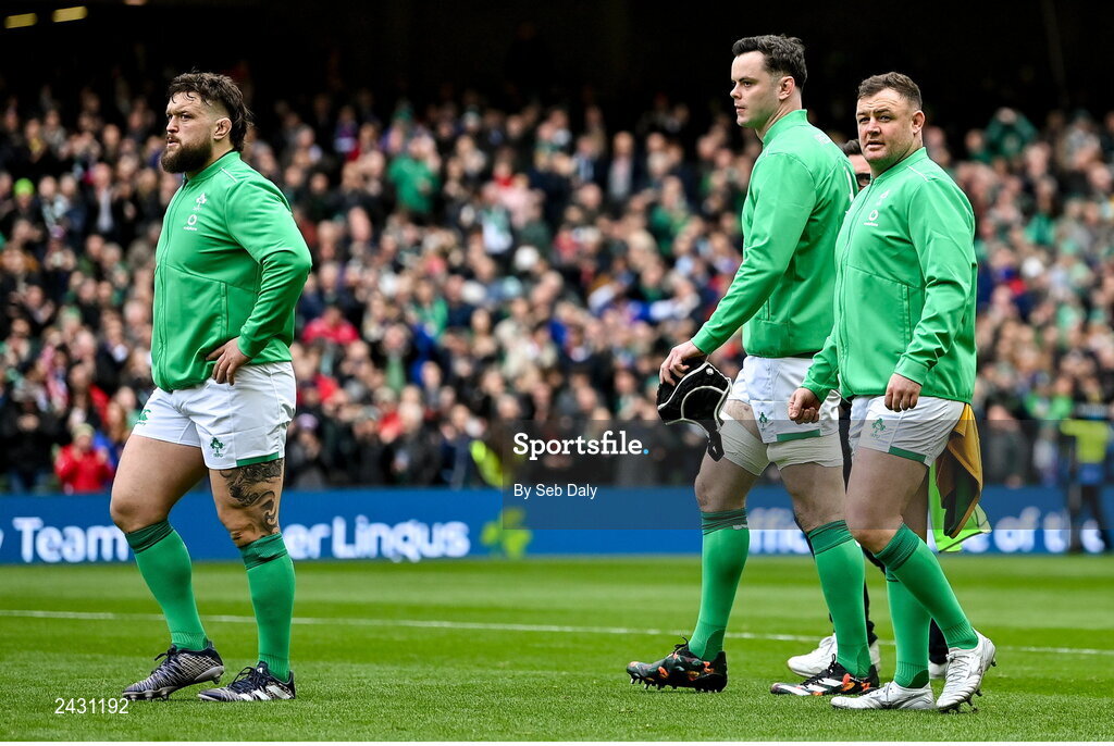 11 February 2023; Ireland players, from left, Andrew Porter, James Ryan and Dave Kilcoyne before their 50th cap in the Guinness Six Nations Rugby Championship match between Ireland and France at the Aviva Stadium in Dublin. Photo by Seb Daly/Sportsfile