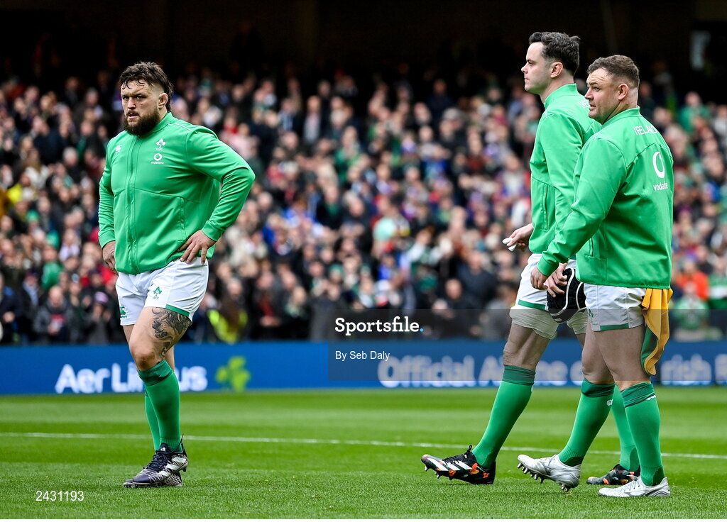 11 February 2023; Ireland players, from left, Andrew Porter, James Ryan and Dave Kilcoyne before their 50th cap in the Guinness Six Nations Rugby Championship match between Ireland and France at the Aviva Stadium in Dublin. Photo by Seb Daly/Sportsfile