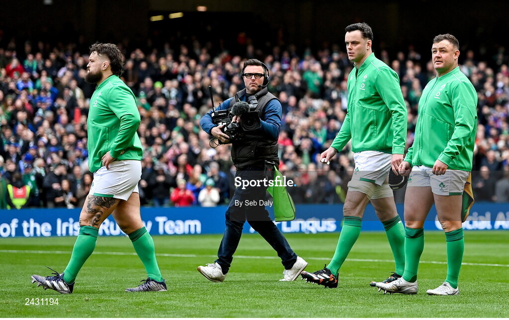 11 February 2023; Ireland players, from left, Andrew Porter, James Ryan and Dave Kilcoyne before their 50th cap in the Guinness Six Nations Rugby Championship match between Ireland and France at the Aviva Stadium in Dublin. Photo by Seb Daly/Sportsfile