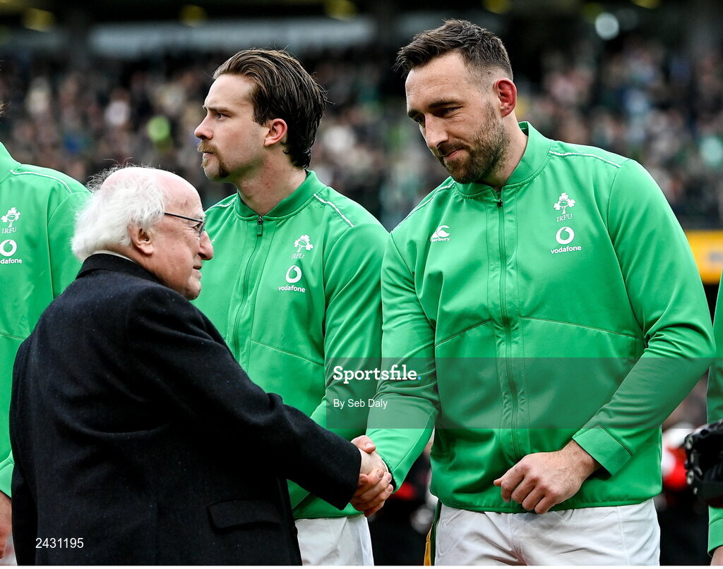 11 February 2023; Jack Conan of Ireland meets President of Ireland Michael D Higgins before the Guinness Six Nations Rugby Championship match between Ireland and France at the Aviva Stadium in Dublin. Photo by Seb Daly/Sportsfile