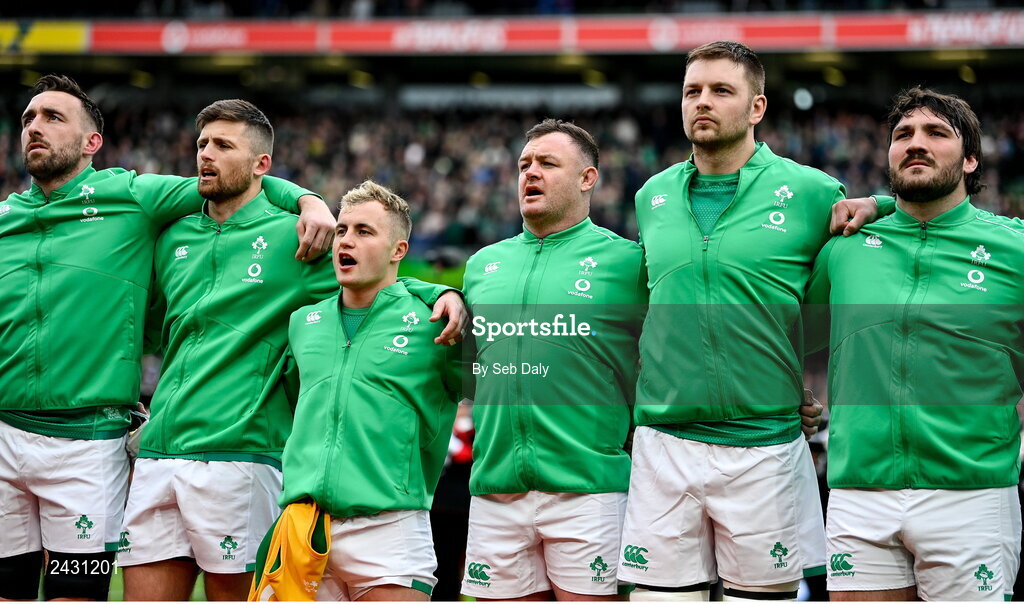 11 February 2023; Ireland players, from left, Jack Conan, Ross Byrne, Craig Casey, Dave Kilcoyne, Iain Henderson and Tom O’Toole before the Guinness Six Nations Rugby Championship match between Ireland and France at the Aviva Stadium in Dublin. Photo by Seb Daly/Sportsfile