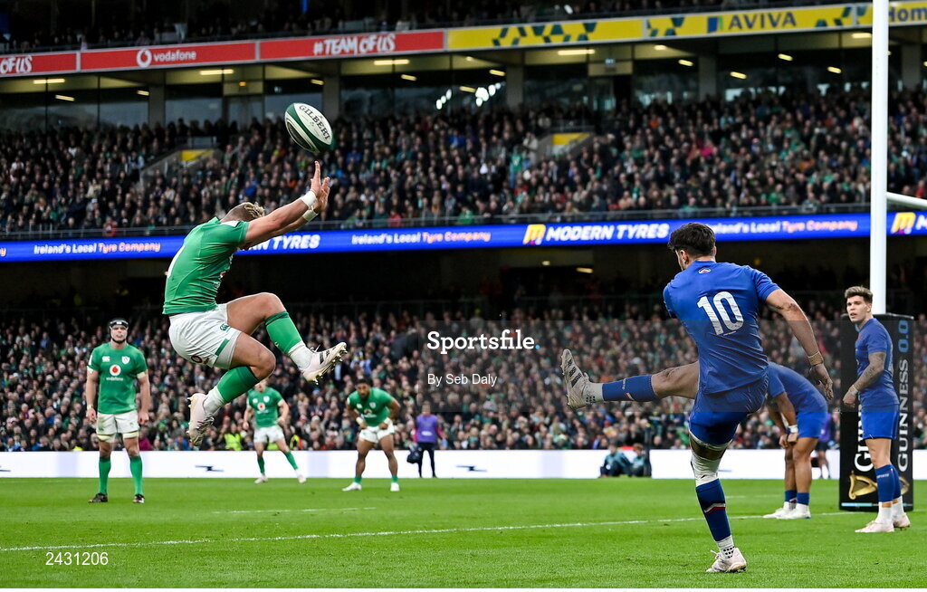 11 February 2023; Romain Ntamack of France kicks downfield under pressure from Craig Casey of Ireland during the Guinness Six Nations Rugby Championship match between Ireland and France at the Aviva Stadium in Dublin. Photo by Seb Daly/Sportsfile