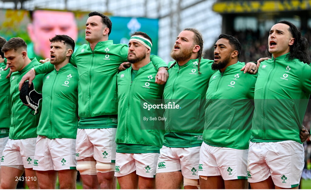 11 February 2023; Ireland players, from left, Garry Ringrose, Hugo Keenan, James Ryan, Rob Herring, Finlay Bealham, Bundee Aki and James Lowe before the Guinness Six Nations Rugby Championship match between Ireland and France at the Aviva Stadium in Dublin. Photo by Seb Daly/Sportsfile