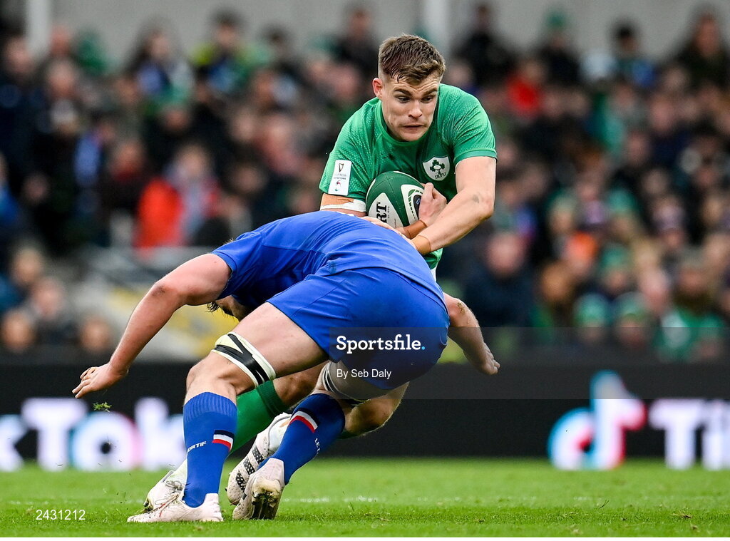 11 February 2023; Garry Ringrose of Ireland is tackled by Anthony Jelonch of France during the Guinness Six Nations Rugby Championship match between Ireland and France at the Aviva Stadium in Dublin. Photo by Seb Daly/Sportsfile