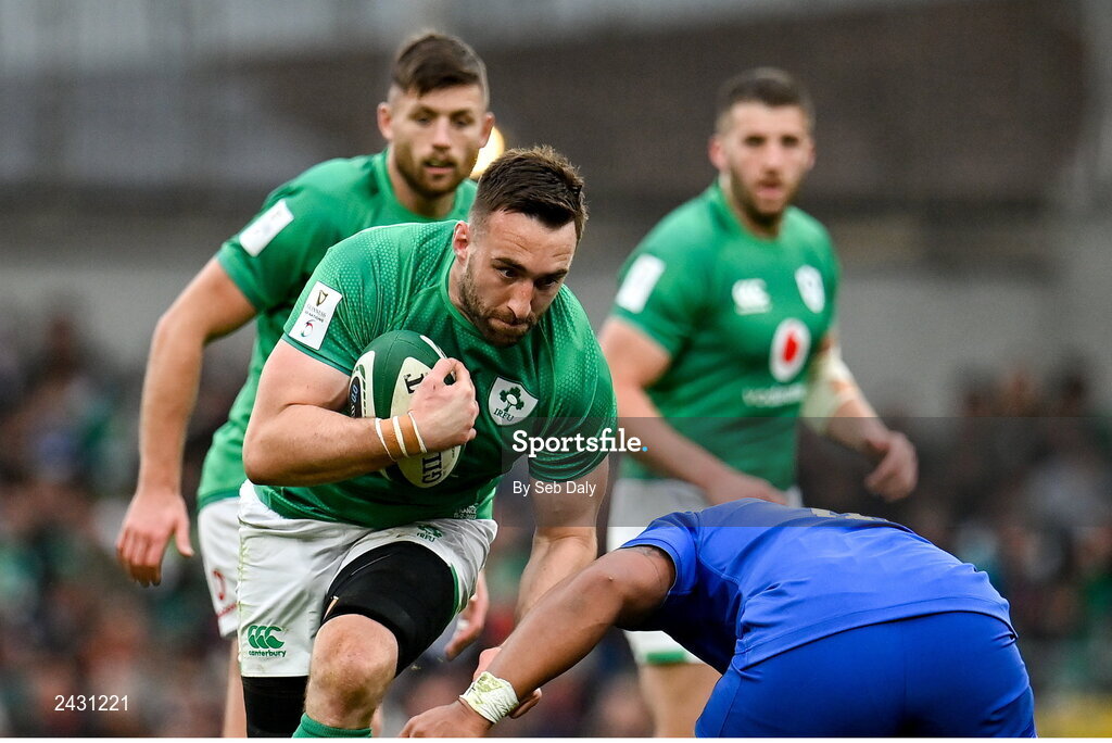 11 February 2023; Jack Conan of Ireland in action against Sipili Falatea of France during the Guinness Six Nations Rugby Championship match between Ireland and France at the Aviva Stadium in Dublin. Photo by Seb Daly/Sportsfile