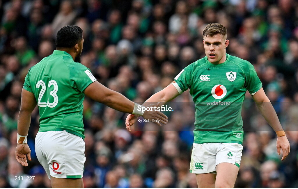 11 February 2023; Garry Ringrose, right, and Bundee Aki of Ireland during the Guinness Six Nations Rugby Championship match between Ireland and France at the Aviva Stadium in Dublin. Photo by Seb Daly/Sportsfile