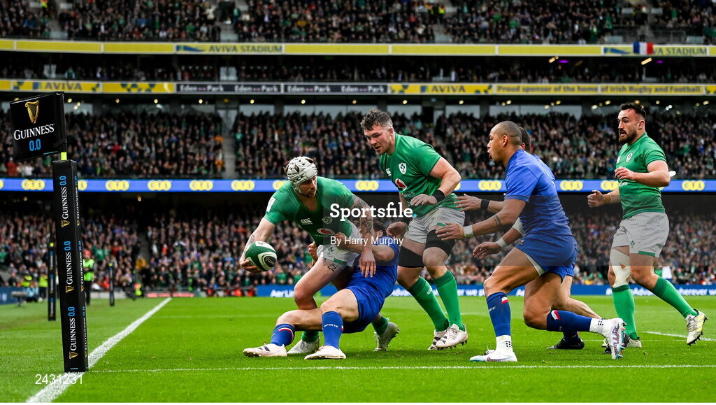 11 February 2023; Mack Hansen of Ireland is tackled close to the line by Antoine Dupont of France during the Guinness Six Nations Rugby Championship match between Ireland and France at the Aviva Stadium in Dublin. Photo by Harry Murphy/Sportsfile
