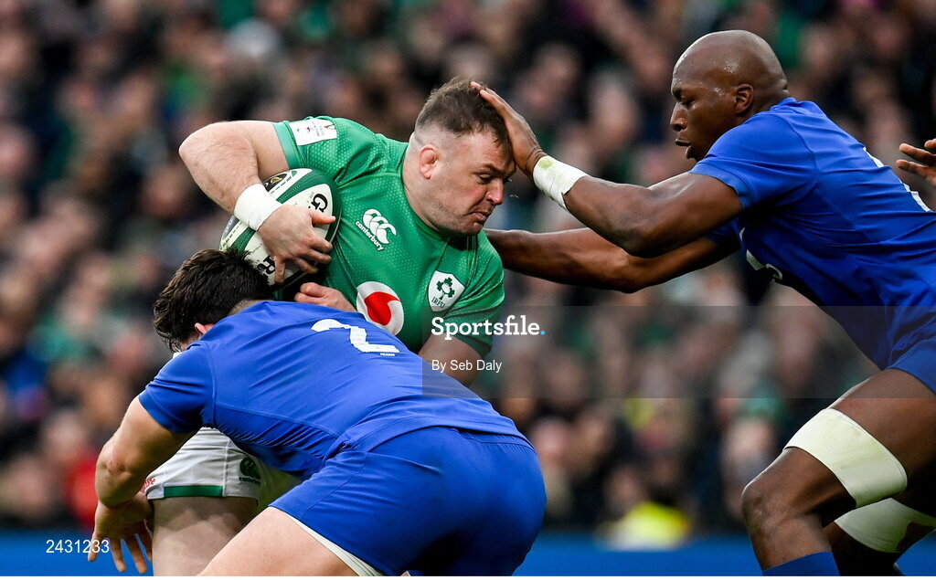 11 February 2023; Dave Kilcoyne of Ireland is tackled by Julien Marchand, left, and Sekou Macalou of France during the Guinness Six Nations Rugby Championship match between Ireland and France at the Aviva Stadium in Dublin. Photo by Seb Daly/Sportsfile