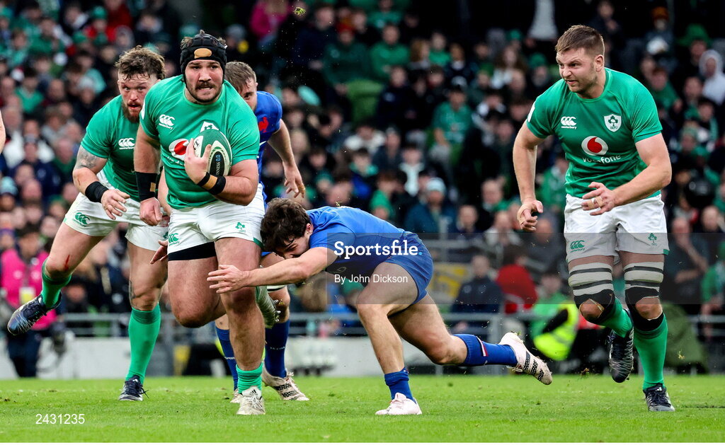 11 February 2023; Tom O’Toole of Ireland is tackled by Antoine Dupont of France during the Guinness Six Nations Rugby Championship match between Ireland and France at the Aviva Stadium in Dublin. Photo by John Dickson/Sportsfile
