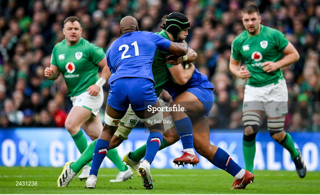 11 February 2023; Caelan Doris of Ireland is tackled by Sekou Macalou, 21, and Sipili Falatea of France during the Guinness Six Nations Rugby Championship match between Ireland and France at the Aviva Stadium in Dublin. Photo by Seb Daly/Sportsfile