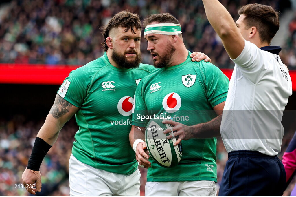 11 February 2023; Andrew Porter, left, and Rob Herring of Ireland during the Guinness Six Nations Rugby Championship match between Ireland and France at the Aviva Stadium in Dublin. Photo by John Dickson/Sportsfile