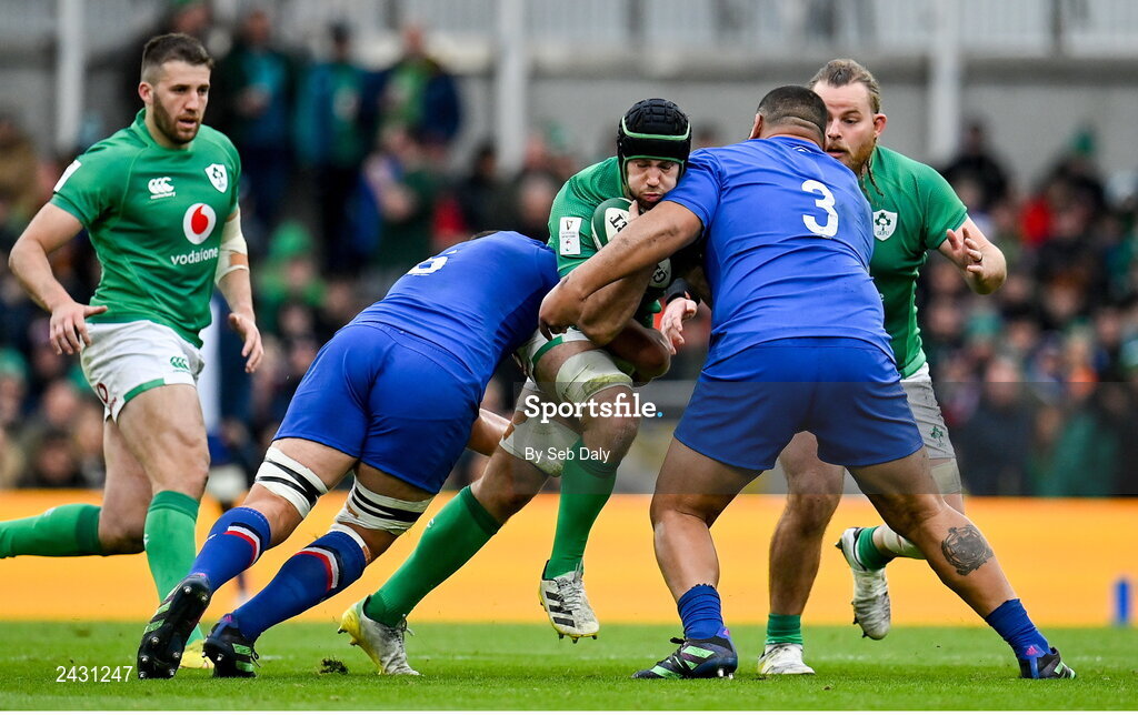 11 February 2023; Caelan Doris of Ireland is tackled by Paul Willemse, left, and Uini Atonio of France during the Guinness Six Nations Rugby Championship match between Ireland and France at the Aviva Stadium in Dublin. Photo by Seb Daly/Sportsfile