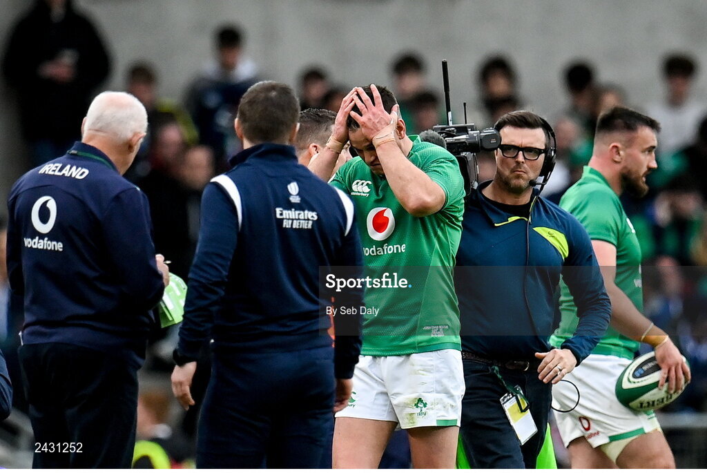 11 February 2023; Jonathan Sexton of Ireland leaves the pitch after sustaining an injury during the Guinness Six Nations Rugby Championship match between Ireland and France at the Aviva Stadium in Dublin. Photo by Seb Daly/Sportsfile