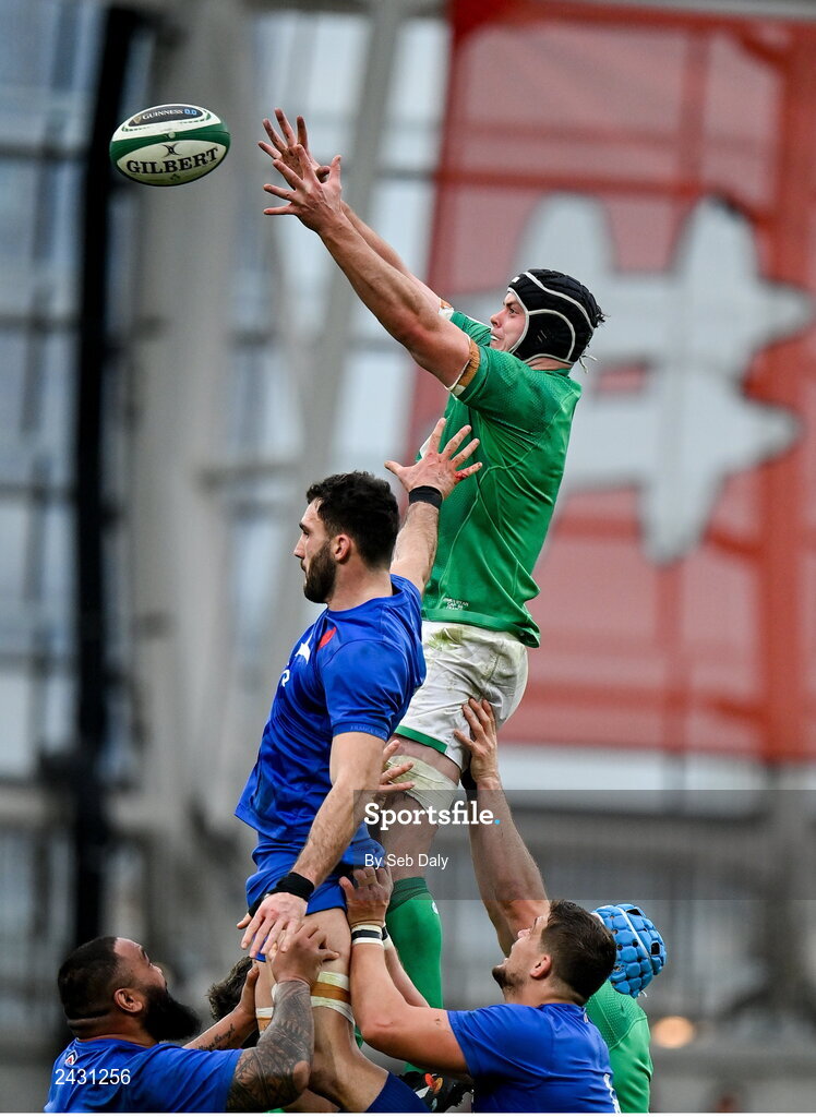 11 February 2023; James Ryan of Ireland takes possession in a lineout ahead of Charles Ollivon of France during the Guinness Six Nations Rugby Championship match between Ireland and France at the Aviva Stadium in Dublin. Photo by Seb Daly/Sportsfile