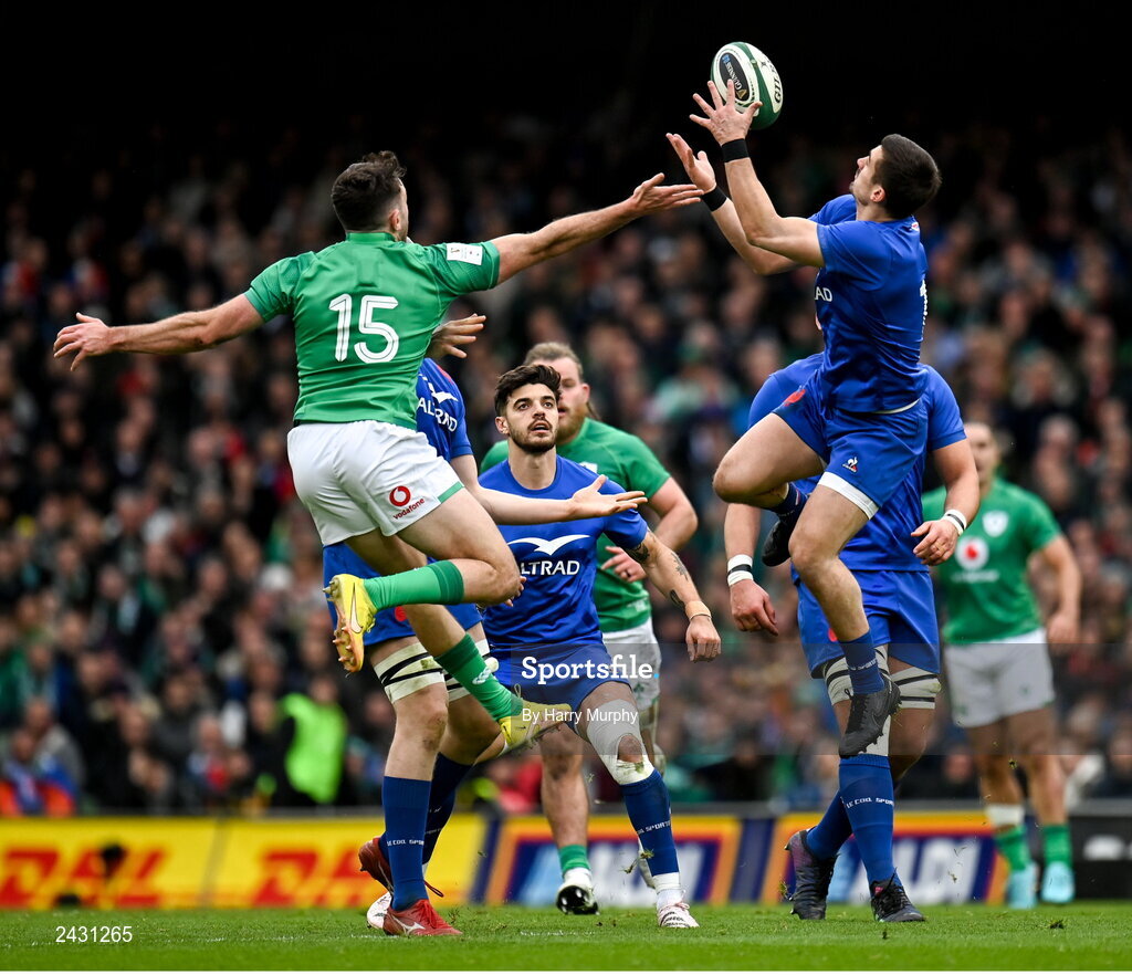 11 February 2023; Thomas Ramos of France and Hugo Keenan of Ireland contest a high ball during the Guinness Six Nations Rugby Championship match between Ireland and France at the Aviva Stadium in Dublin. Photo by Harry Murphy/Sportsfile