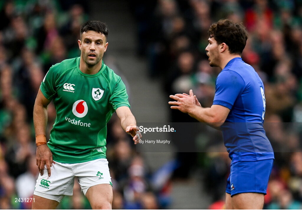 11 February 2023; Conor Murray of Ireland and Antoine Dupont of France during the Guinness Six Nations Rugby Championship match between Ireland and France at the Aviva Stadium in Dublin. Photo by Harry Murphy/Sportsfile