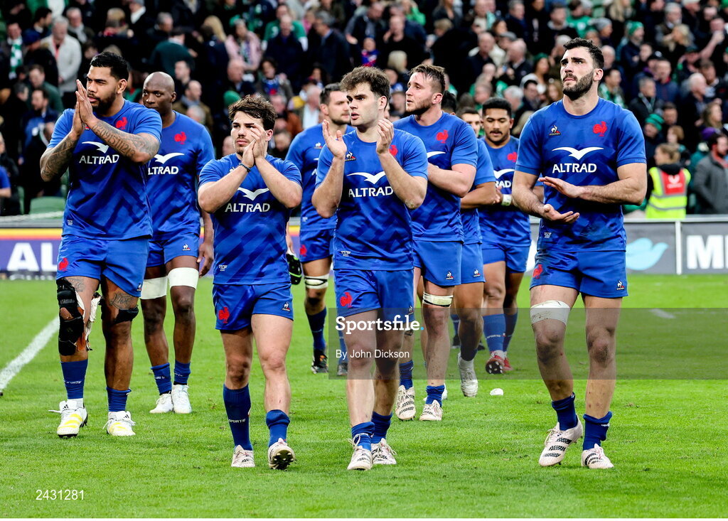 11 February 2023; French players thank their supporters after the Guinness Six Nations Rugby Championship match between Ireland and France at the Aviva Stadium in Dublin. Photo by John Dickson/Sportsfile