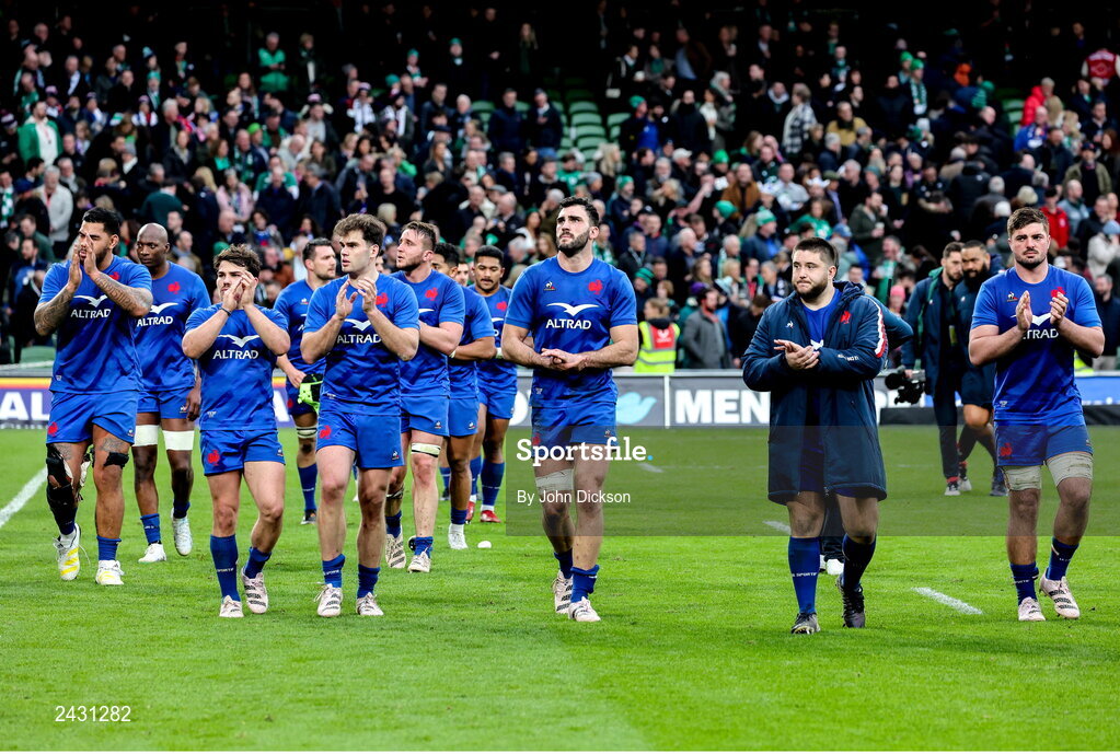 11 February 2023; French players thank their supporters after the Guinness Six Nations Rugby Championship match between Ireland and France at the Aviva Stadium in Dublin. Photo by John Dickson/Sportsfile