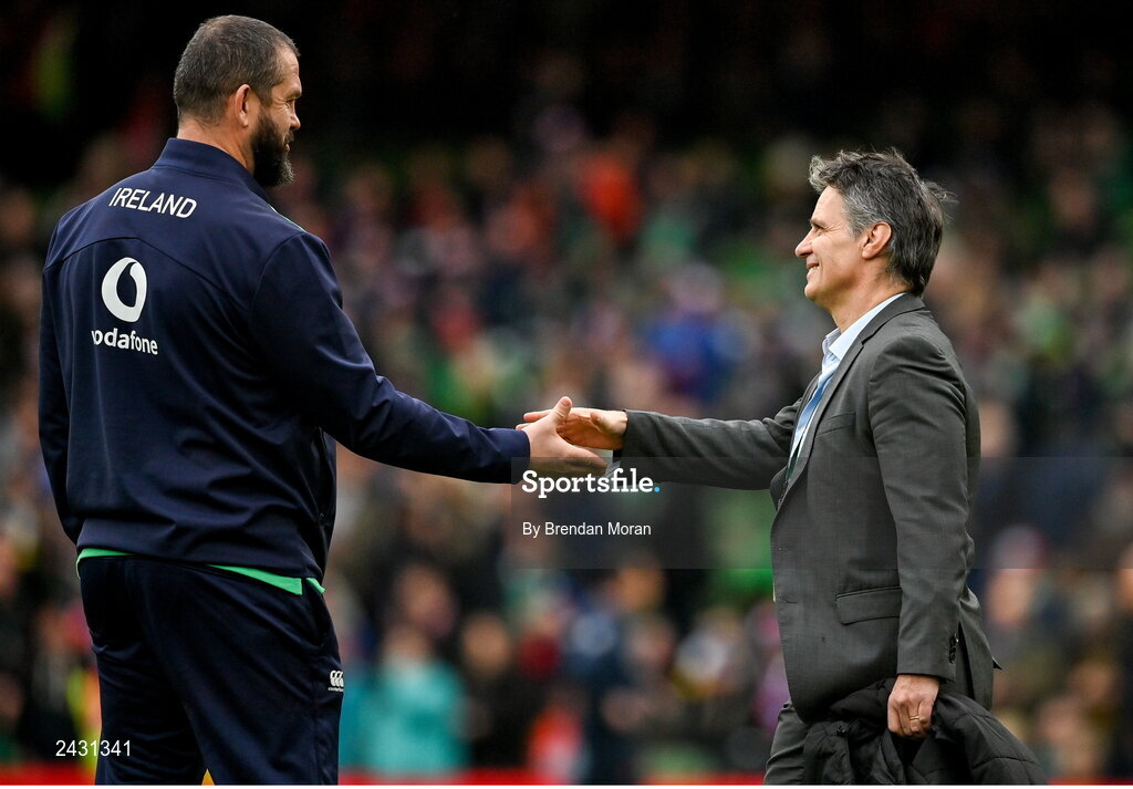 11 February 2023; Ireland head coach Andy Farrell, left, and World Rugby head of match officials Joël Jutge before the Guinness Six Nations Rugby Championship match between Ireland and France at the Aviva Stadium in Dublin. Photo by Brendan Moran/Sportsfile