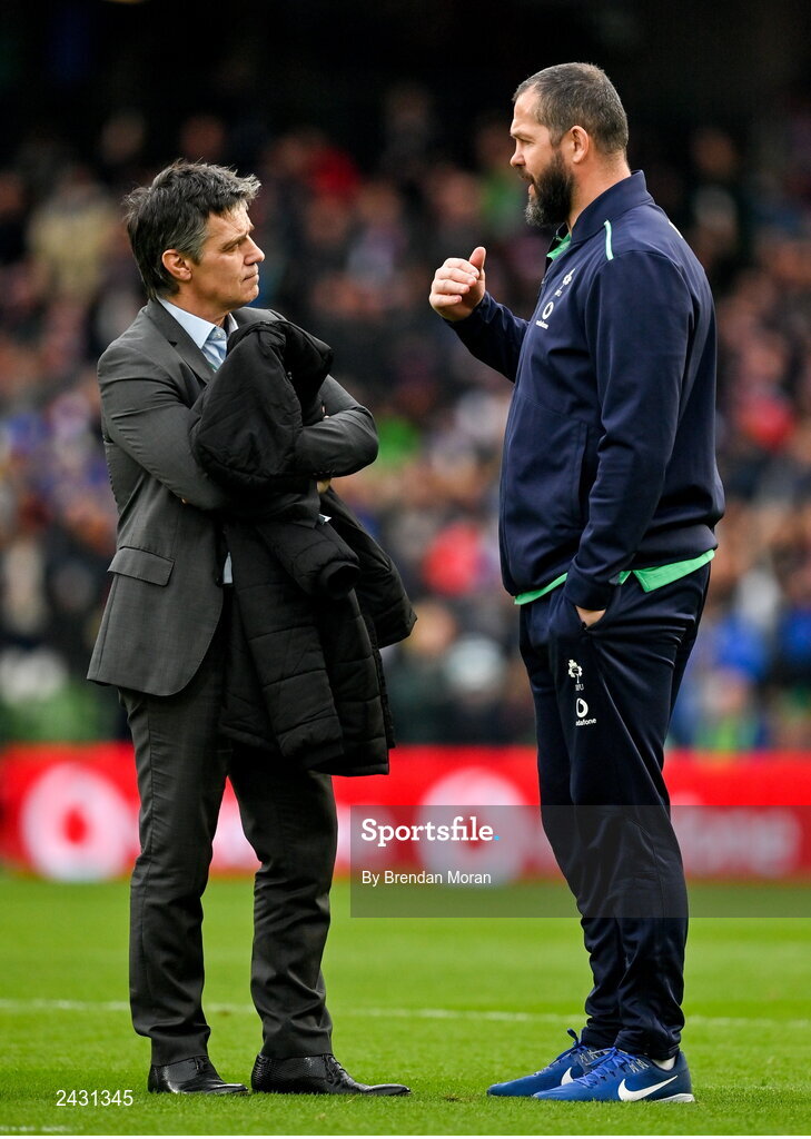 11 February 2023; Ireland head coach Andy Farrell, right, and World Rugby head of match officials Joël Jutge before the Guinness Six Nations Rugby Championship match between Ireland and France at the Aviva Stadium in Dublin. Photo by Brendan Moran/Sportsfile