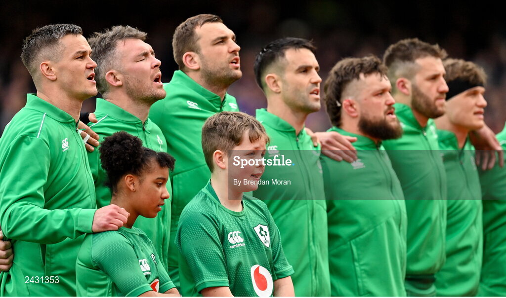 11 February 2023; Ireland captain Jonathan Sexton and his teammates stand for the national anthems before the Guinness Six Nations Rugby Championship match between Ireland and France at the Aviva Stadium in Dublin. Photo by Brendan Moran/Sportsfile