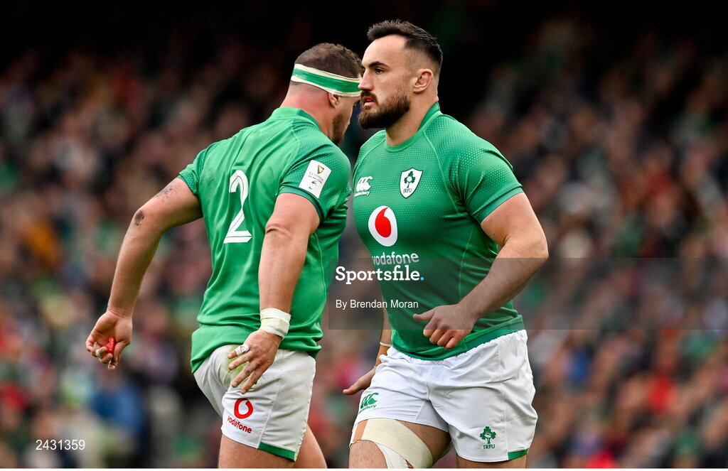 11 February 2023; Rónan Kelleher of Ireland, right, runs on to replace teammate Rob Herring during the Guinness Six Nations Rugby Championship match between Ireland and France at the Aviva Stadium in Dublin. Photo by Brendan Moran/Sportsfile